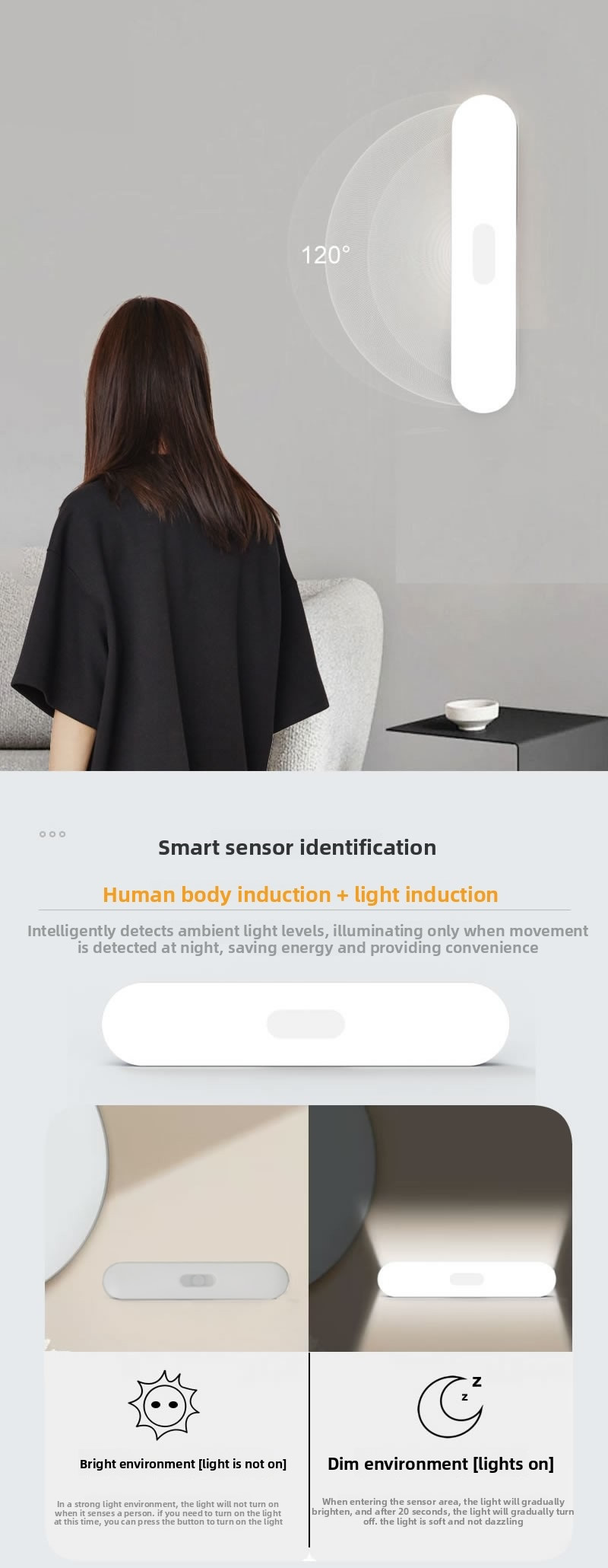 Product material: ABS/HDPE Sense distance: 0~4M Battery: 500mah Light source:Warm tone Product size: ≈200x41x20mm