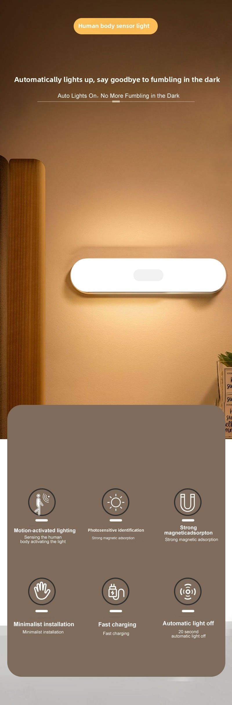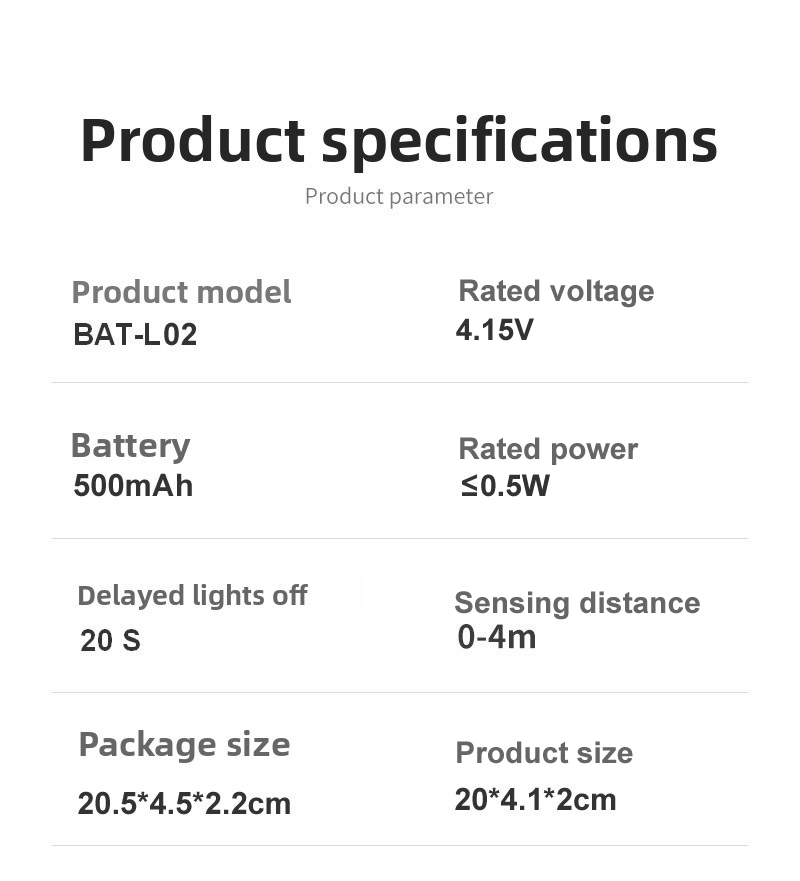 Product material: ABS/HDPE Sense distance: 0~4M Battery: 500mah Light source:Warm tone Product size: ≈200x41x20mm